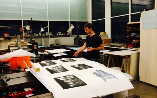 Artists working in intaglio, relief, lithography and letterpress techniques participated at the Druckwerk Printmaking Studio in central Basel, Switzerland, from July 27 to August 10, 2014, concluding with an exhibition at the Kaskadenkondensator Basel Gallery. Grid/Flow / Was Hängen Bleibt was the theme, chosen collaboratively and interpreted individually by participants during their time in the workshop.