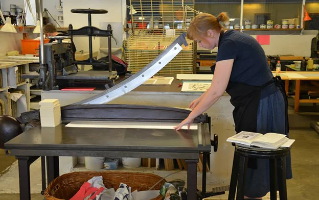 Artists working in intaglio, relief, lithography and letterpress techniques participated at the Druckwerk Printmaking Studio in central Basel, Switzerland, from July 22 to August 2, 2015, concluding with an exhibition at the Kaskadenkondensator Basel Gallery. Unbemerkt/Unnoticed was the theme, chosen collaboratively and interpreted individually by participants during their time in the workshop.