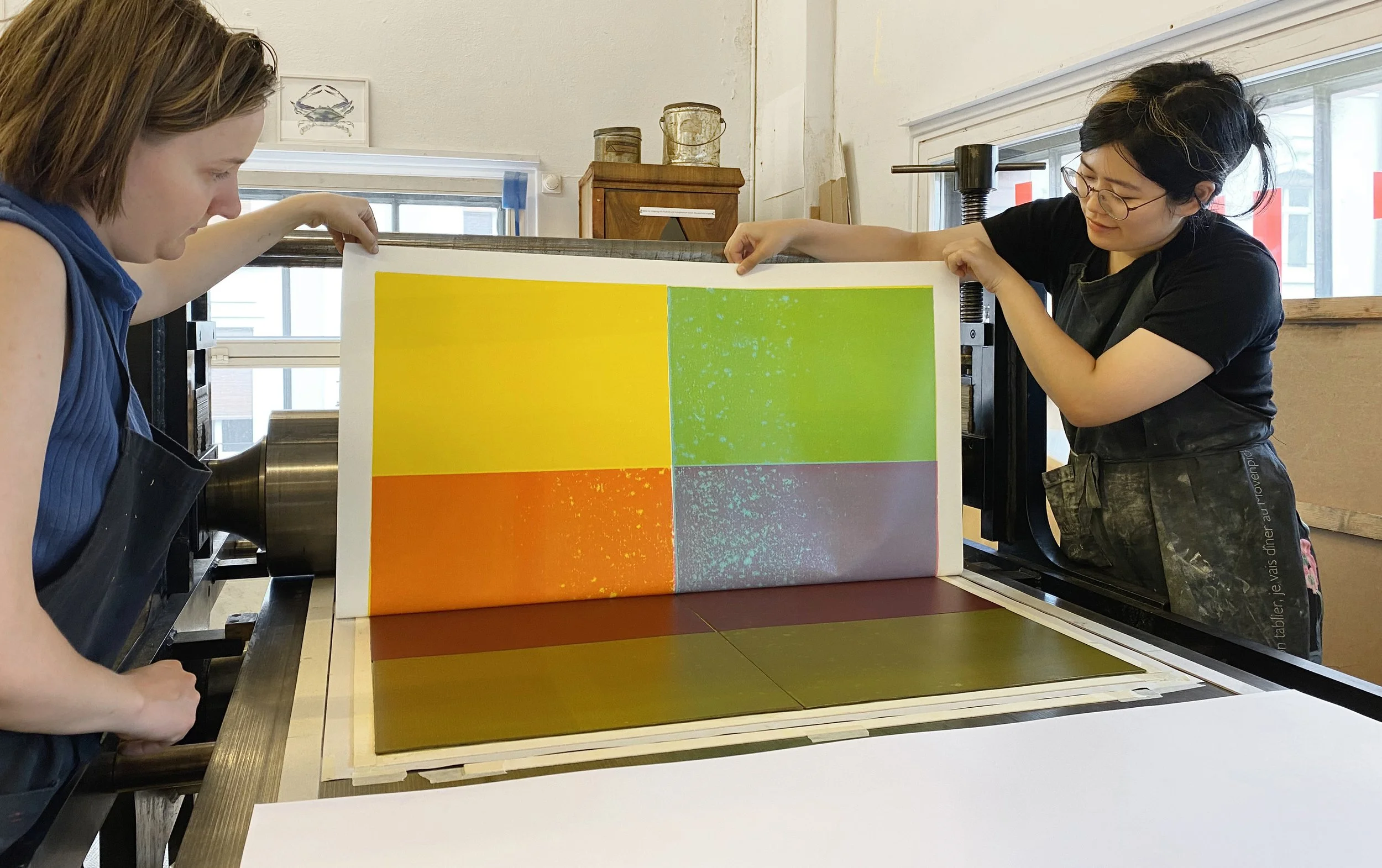 Artists working in intaglio, relief, lithography and letterpress techniques participated at the Druckwerk Printmaking Studio in central Basel, Switzerland, from August 2 to 13, 2023. The artists chose the title "da capo a capo" as a starting point for making their artworks. The 12 days of collaborative printmaking culminated in an exhibition at KASKO, the project space for contemporary art in Basel.